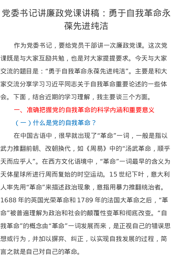 党委书记讲廉政党课讲稿:勇于自我革命永葆先进纯洁
