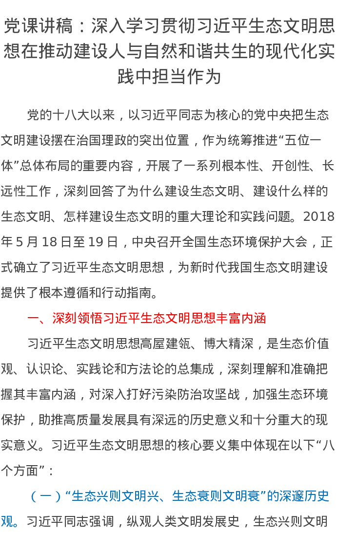 党课讲稿:深入学习贯彻习近平生态文明思想在推动建设人与自然和谐共生的现代化实践中担当作为