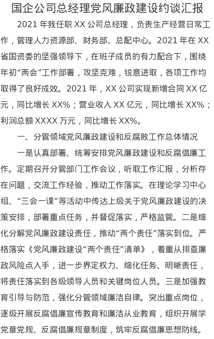 国企公司总经理党风廉政建设约谈汇报