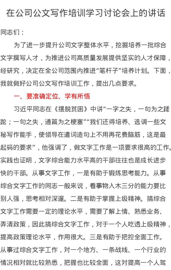 在公司公文写作培训学习讨论会上的讲话