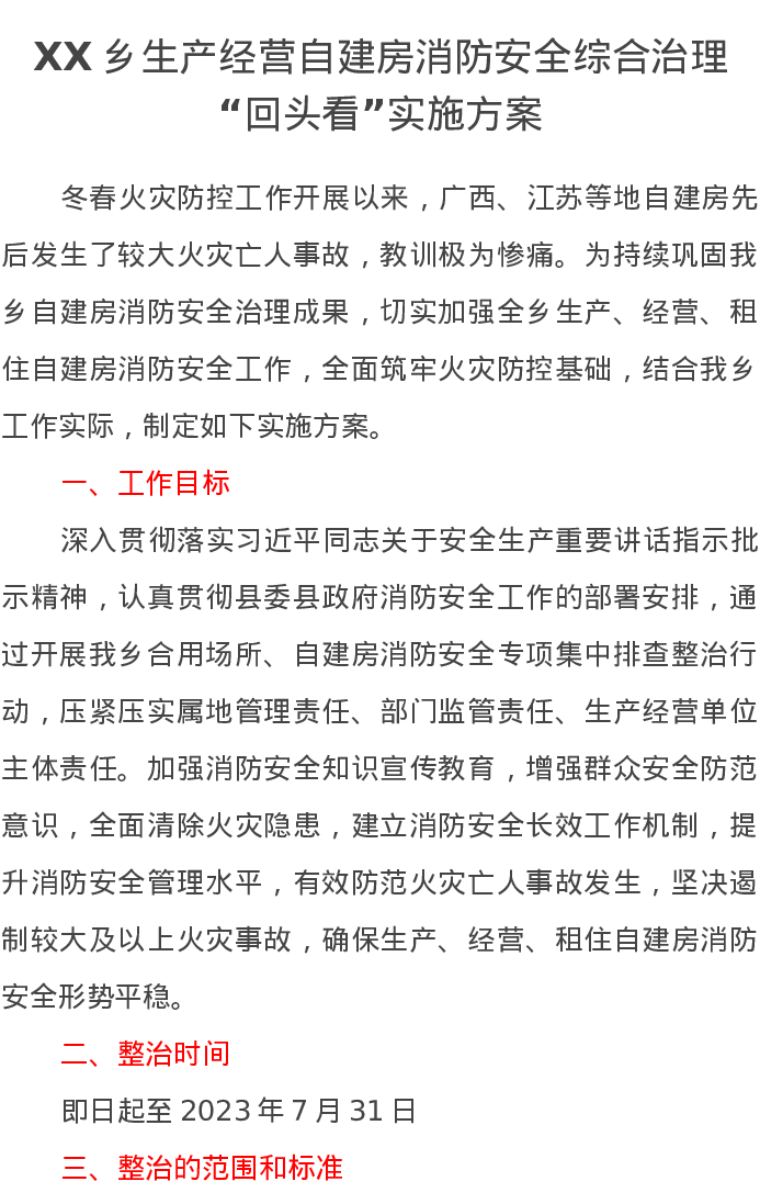 XX乡生产经营自建房消防安全综合治理“回头看”实施方案