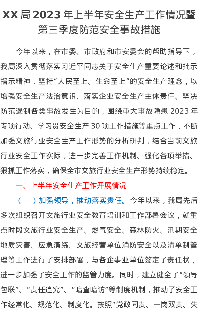 XX局2023年上半年安全生产工作情况暨第三季度防范安全事故措施