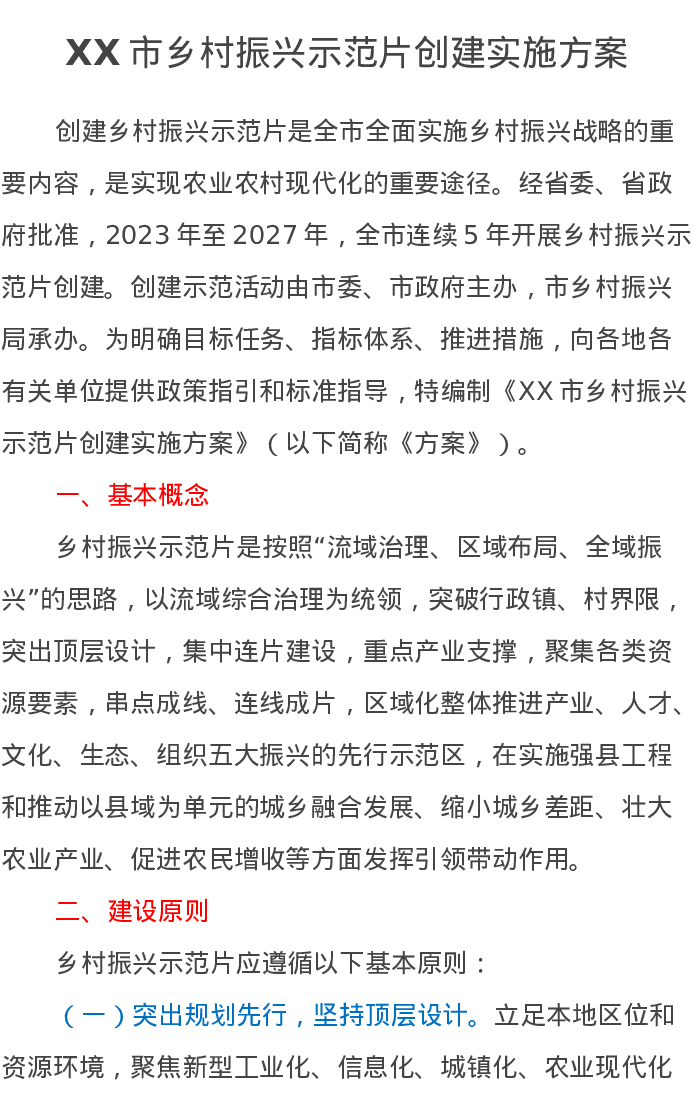 XX市乡村振兴示范片创建实施方案