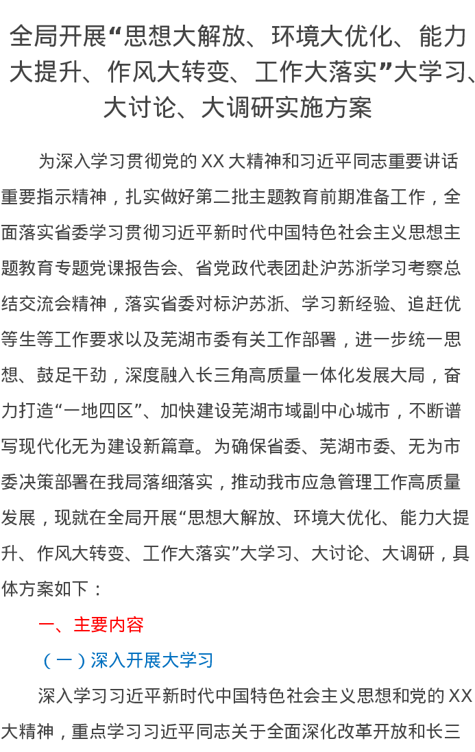 全局开展“思想大解放、环境大优化、能力大提升、作风大转变、工作大落实”大学习、大讨论、大调研实施方案