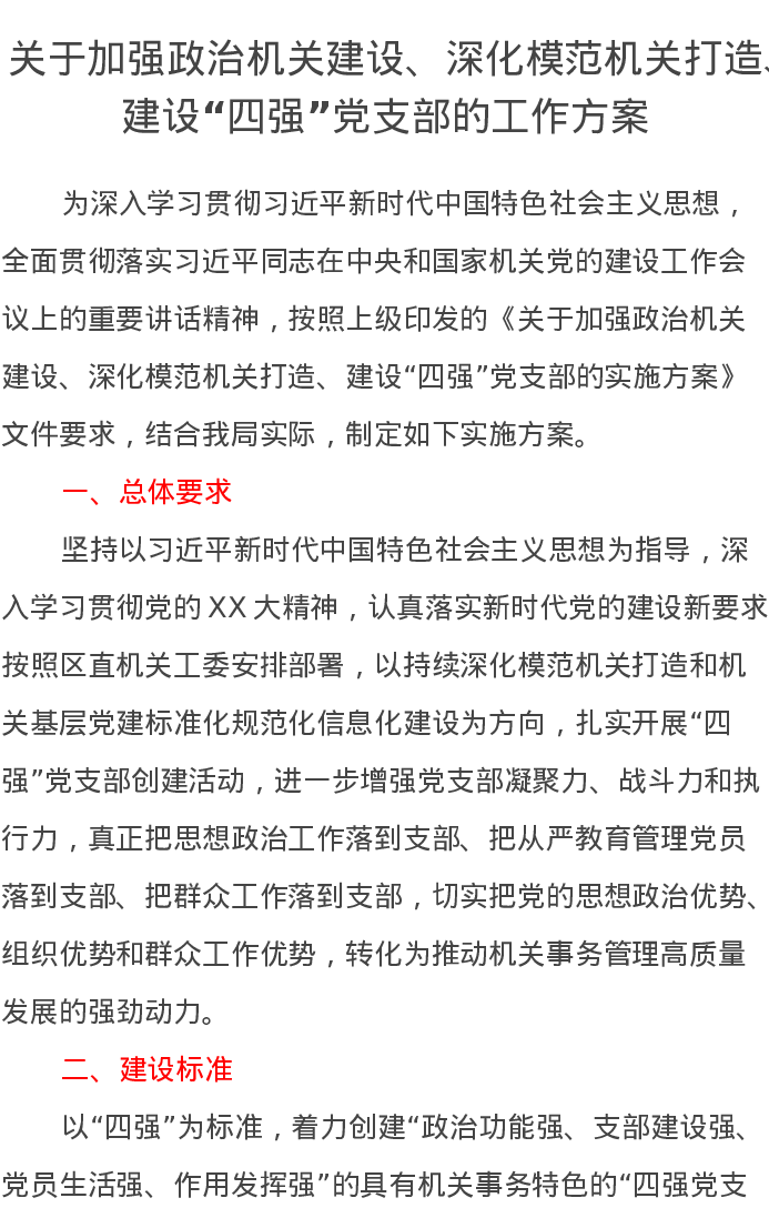 关于加强政治机关建设、深化模范机关打造、建设“四强”党支部的工作方案