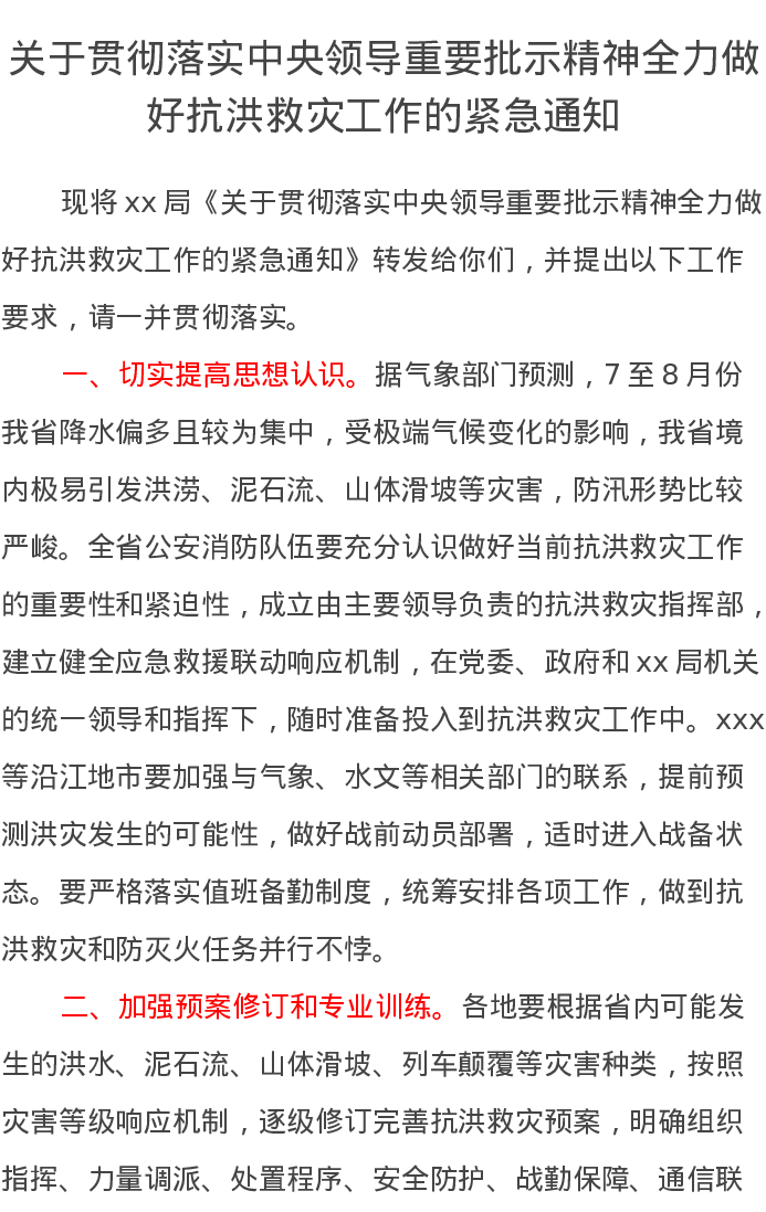 关于贯彻落实中央领导重要批示精神全力做好抗洪救灾工作的紧急通知