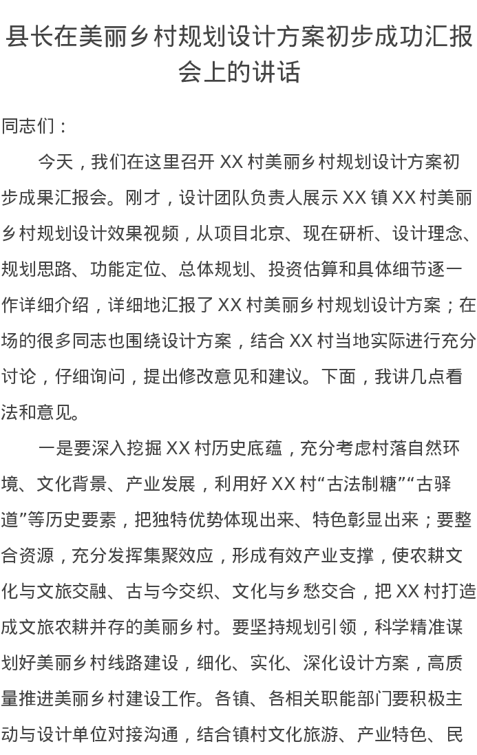 县长在美丽乡村规划设计方案初步成功汇报会上的讲话