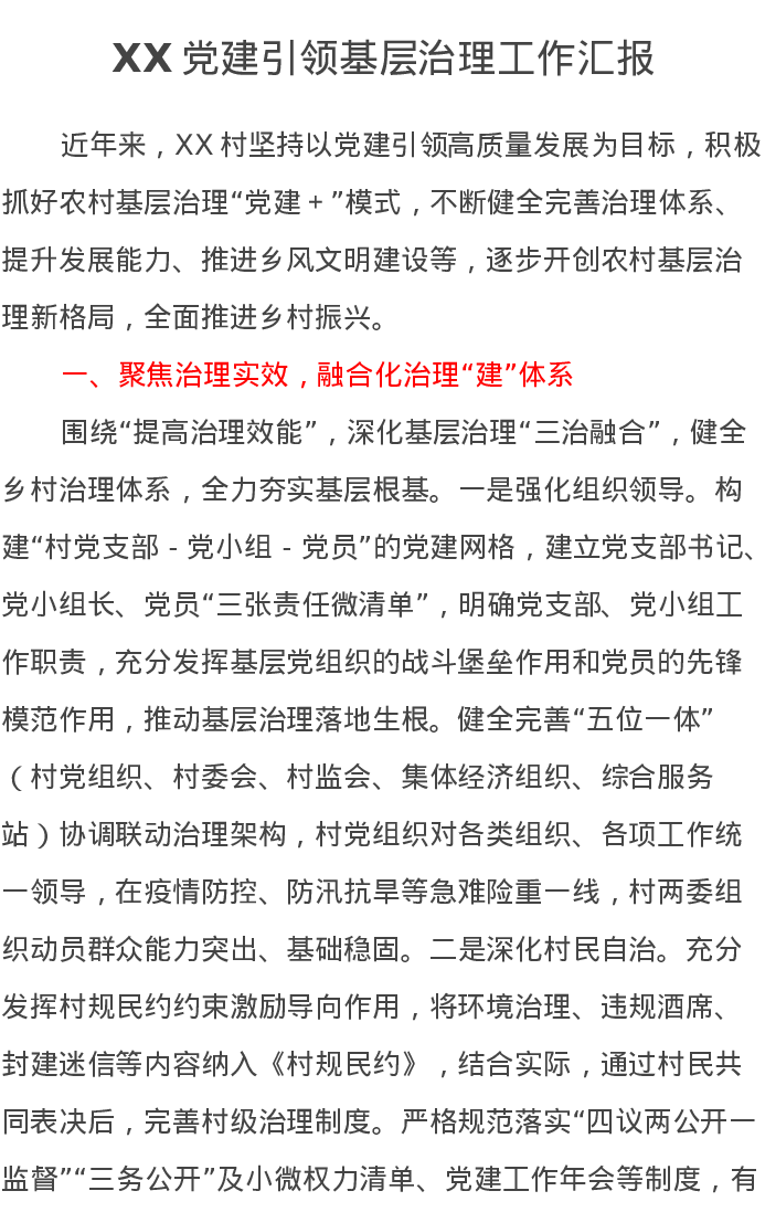 XX党建引领基层治理工作汇报