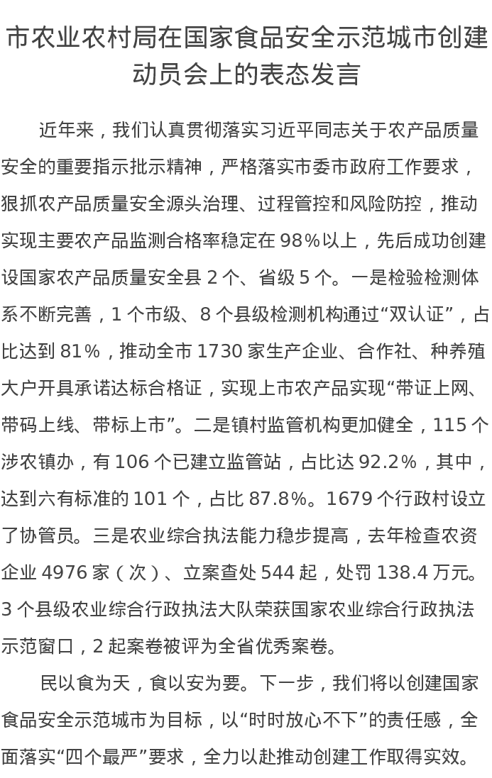 市农业农村局在国家食品安全示范城市创建动员会上的表态发言