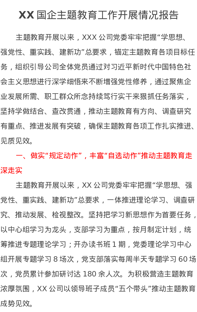 XX国企主题教育工作开展情况报告(特色社会主义思想)