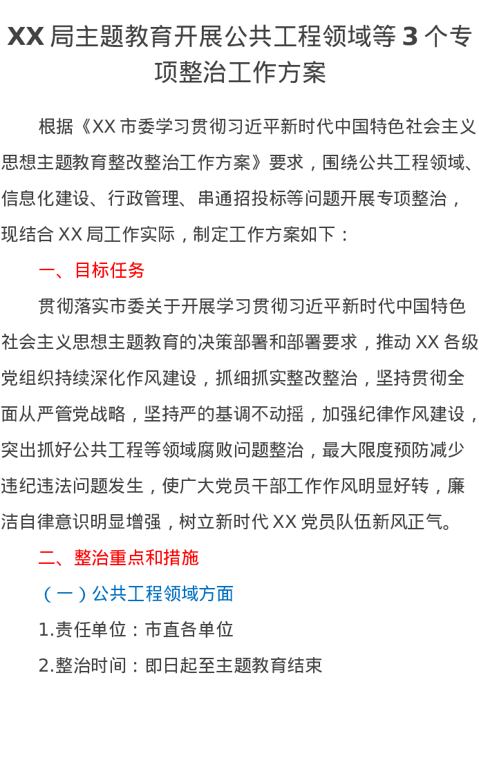 XX局主题教育开展公共工程领域等3个专项整治工作方案(特色社会主义思想)