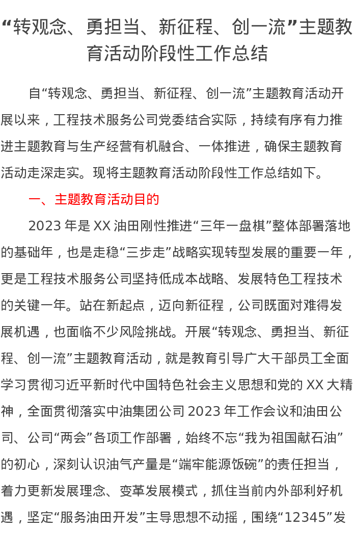 “转观念、勇担当、新征程、创一流”主题教育活动阶段性工作总结(特色社会主义思想)