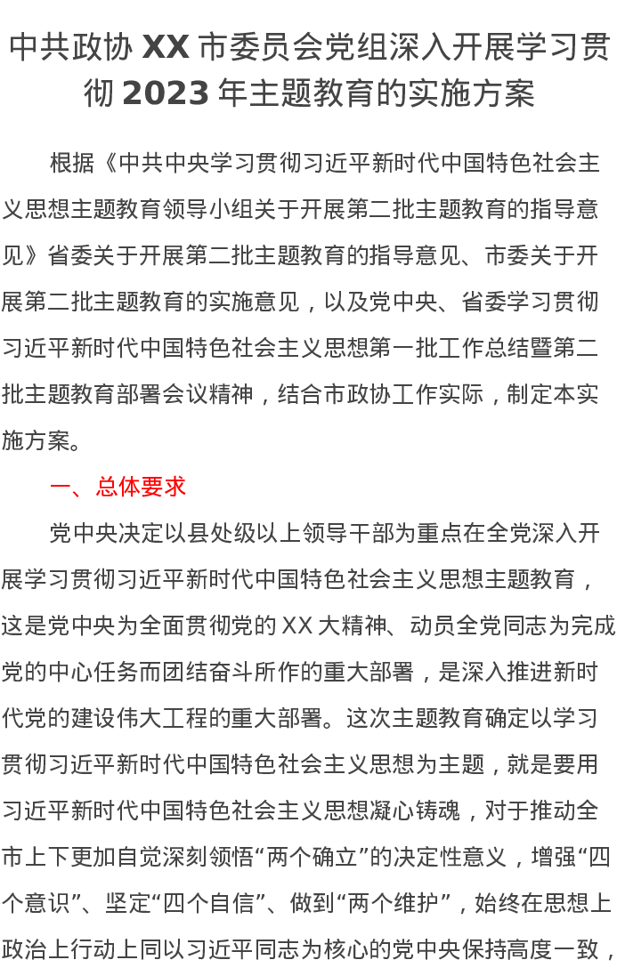 中共政协XX市委员会党组深入开展学习贯彻2023年主题教育的实施方案(特色社会主义思想)