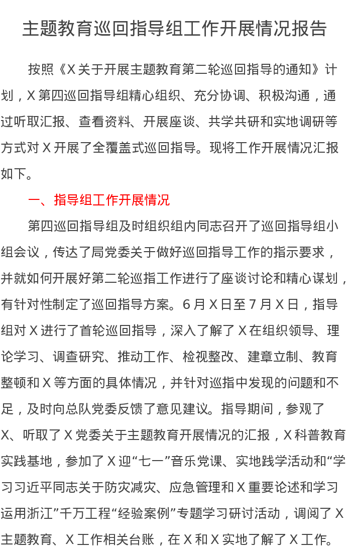主题教育巡回指导组工作开展情况报告(特色社会主义思想)
