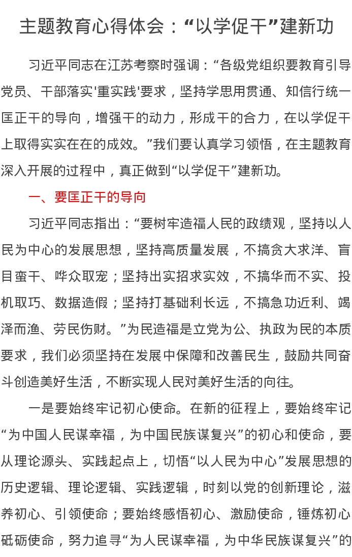 主题教育心得体会:“以学促干”建新功(特色社会主义思想)