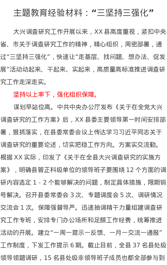 主题教育经验材料:“三坚持三强化”(特色社会主义思想)