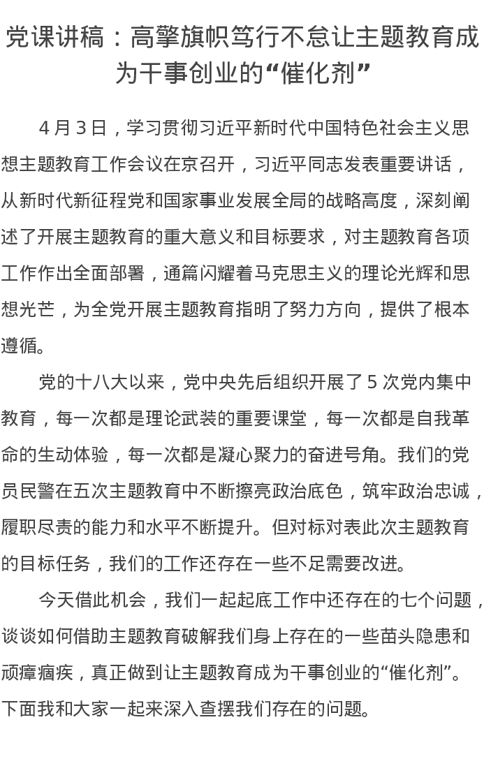 党课讲稿:高擎旗帜笃行不怠让主题教育成为干事创业的“催化剂”(特色社会主义思想)