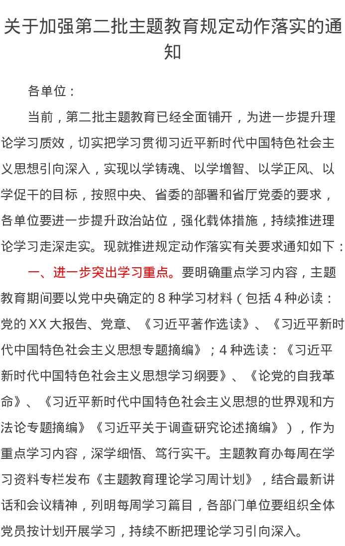关于加强第二批主题教育规定动作落实的通知(特色社会主义思想)