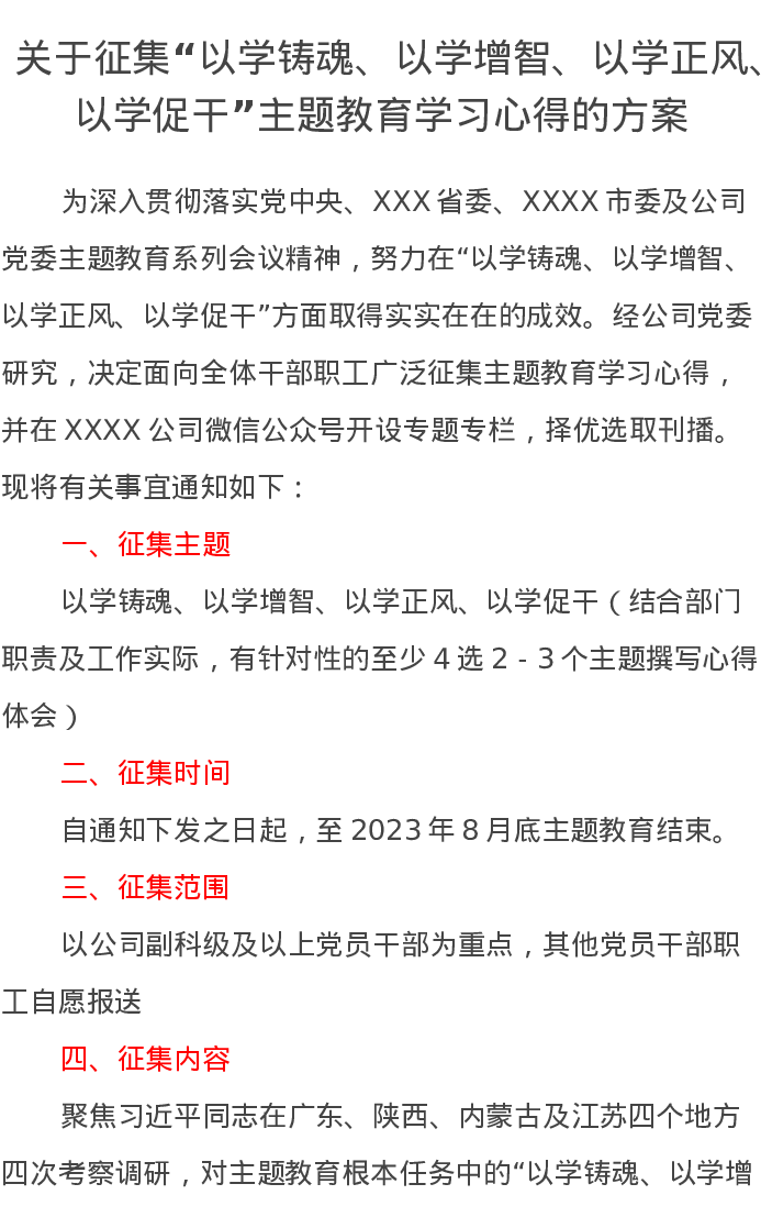 关于征集“以学铸魂、以学增智、以学正风、以学促干”主题教育学习心得的方案