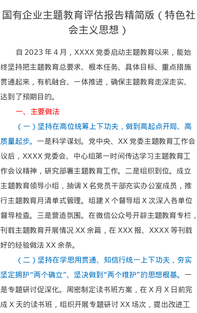 国有企业主题教育评估报告精简版(特色社会主义思想)