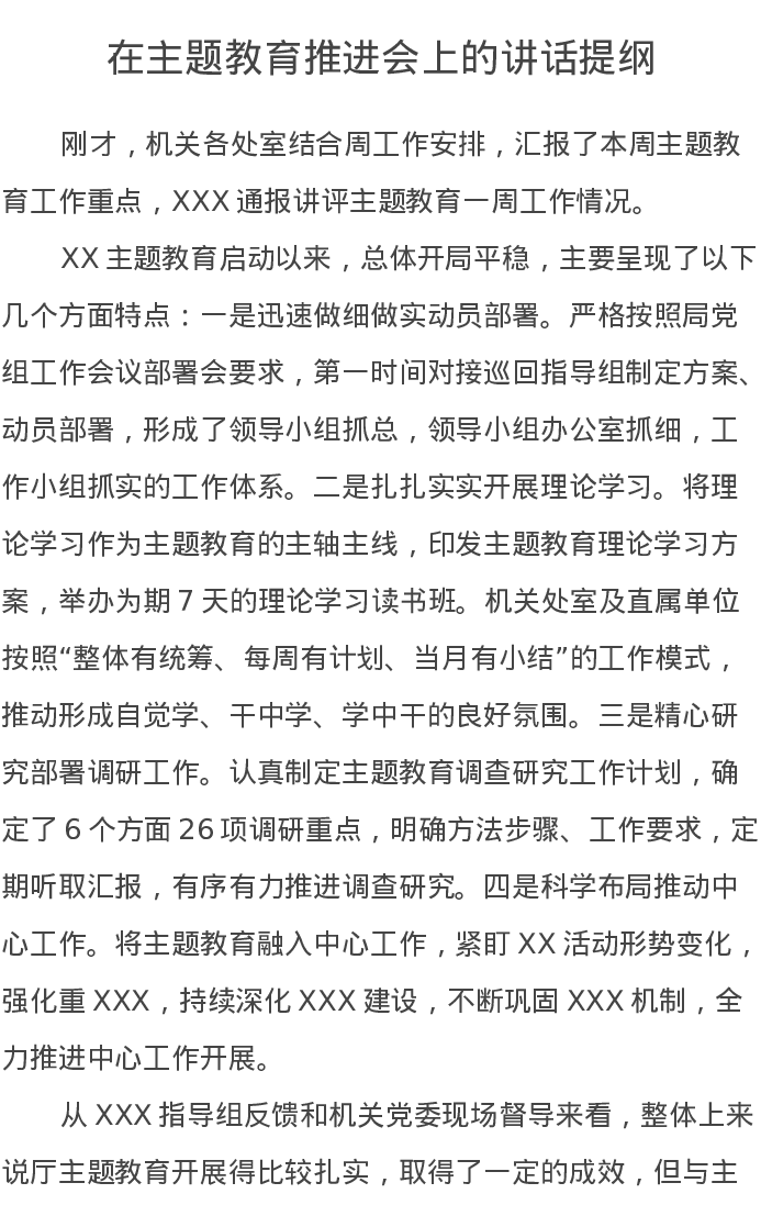 在主题教育推进会上的讲话提纲(特色社会主义思想)