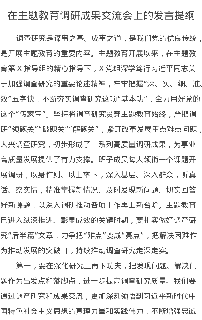 在主题教育调研成果交流会上的发言提纲(特色社会主义思想)