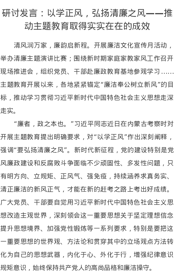 研讨发言:以学正风,弘扬清廉之风——推动主题教育取得实实在在的成效