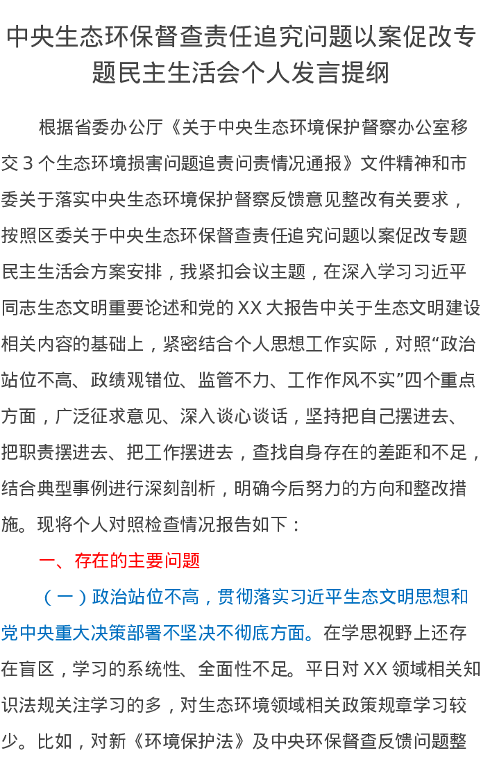 中央生态环保督查责任追究问题以案促改专题民主生活会个人发言提纲