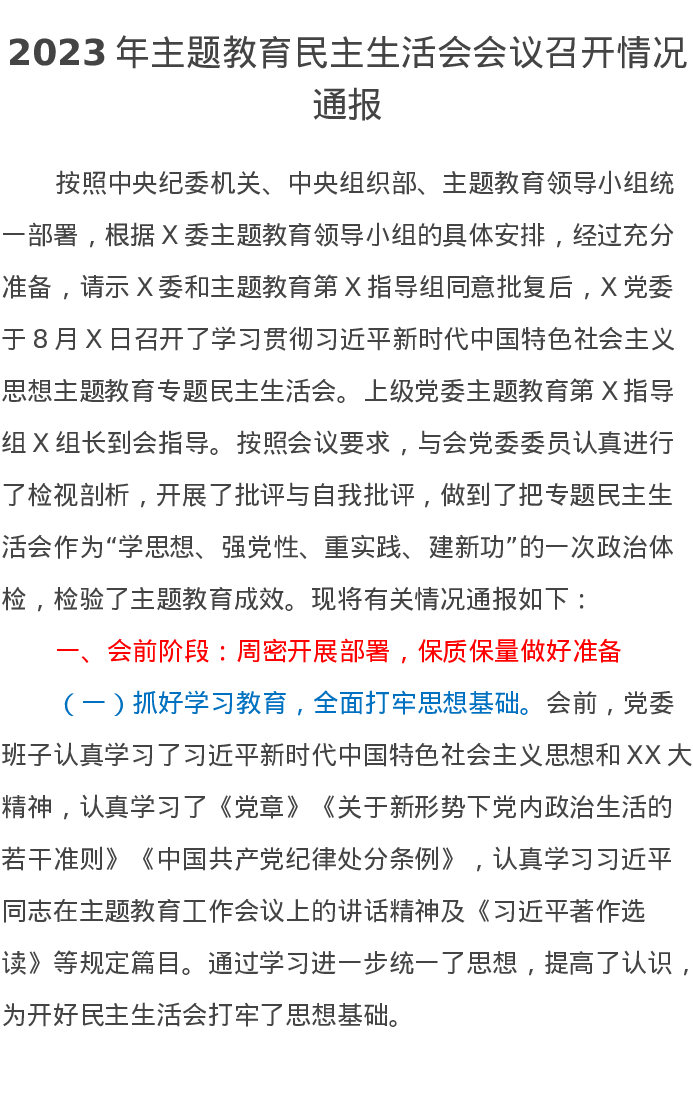 2023年主题教育民主生活会会议召开情况通报(特色社会主义思想)