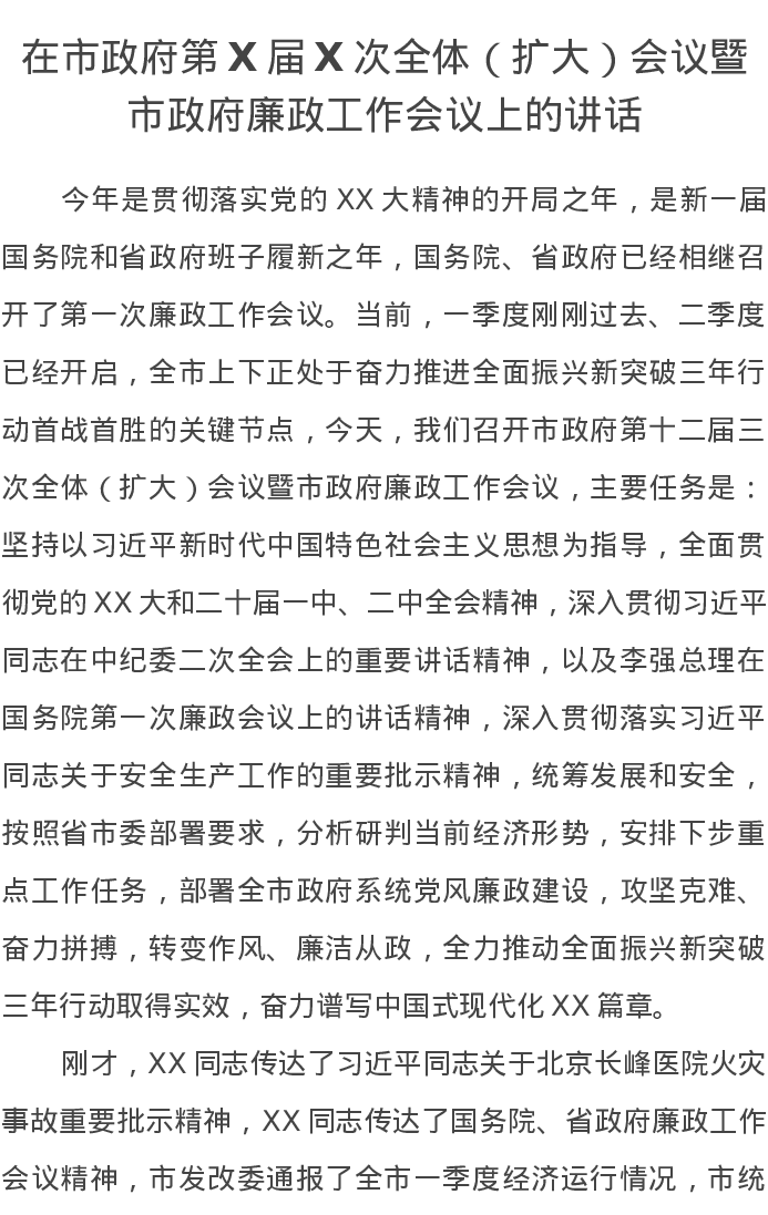在市政府第X届X次全体(扩大)会议暨市政府廉政工作会议上的讲话