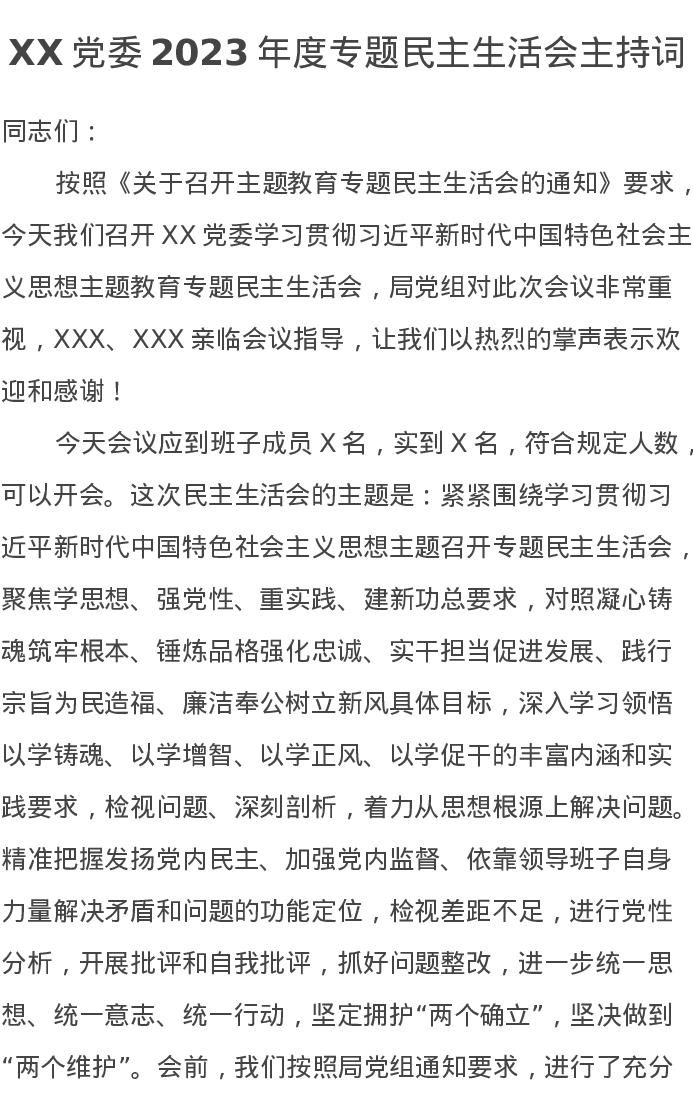 XX党委2023年度专题民主生活会主持词(特色社会主义思想)