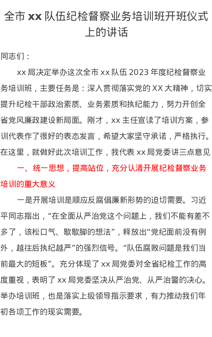 全市xx队伍纪检督察业务培训班开班仪式上的讲话
