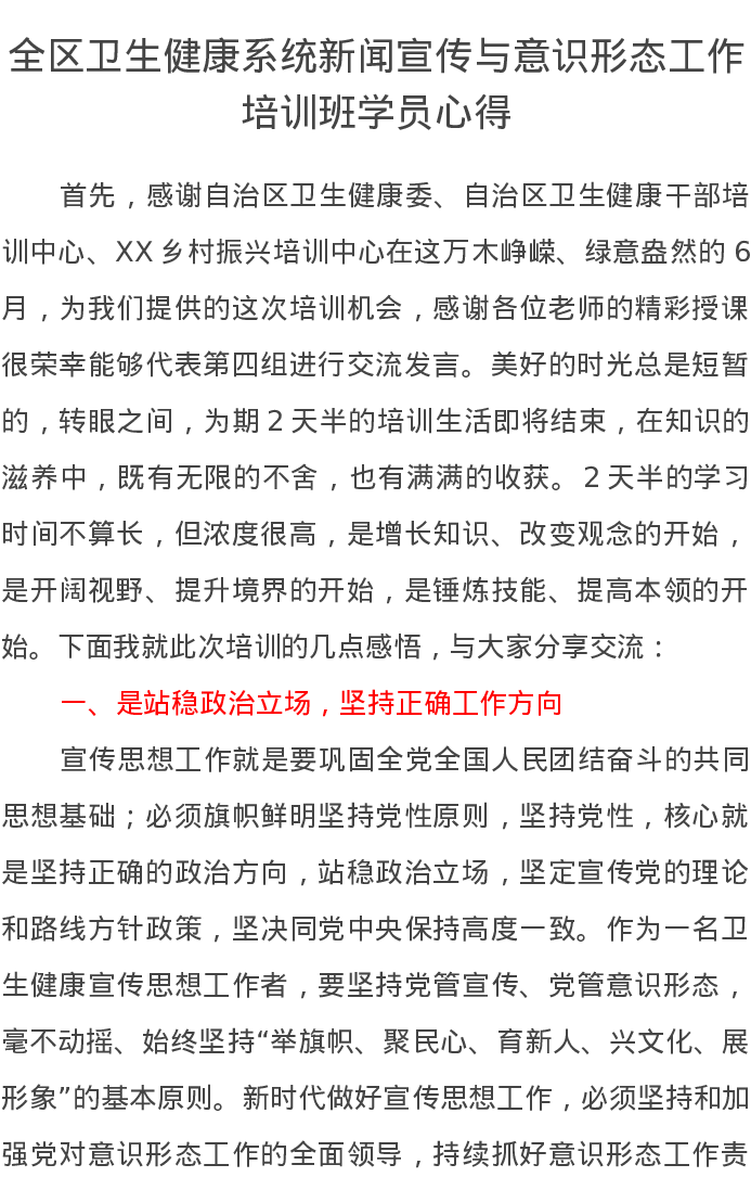 全区卫生健康系统新闻宣传与意识形态工作培训班学员心得