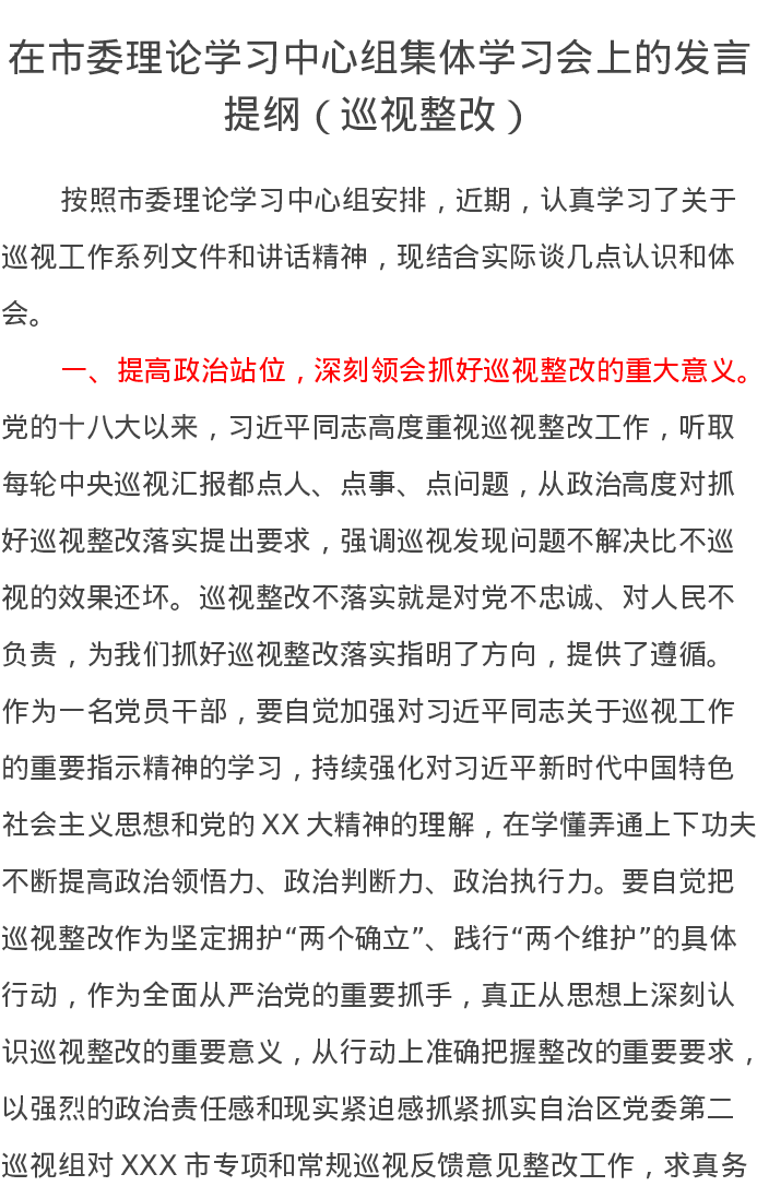 在市委理论学习中心组集体学习会上的发言提纲(巡视整改)