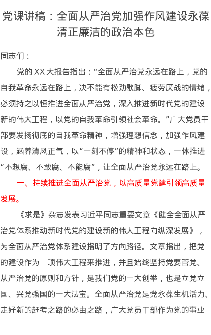 党课讲稿:全面从严治党加强作风建设永葆清正廉洁的政治本色