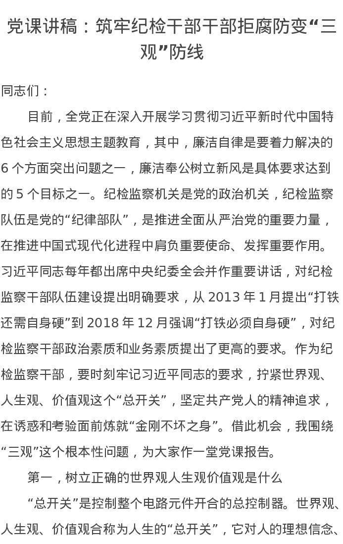 党课讲稿:筑牢纪检干部干部拒腐防变“三观”防线