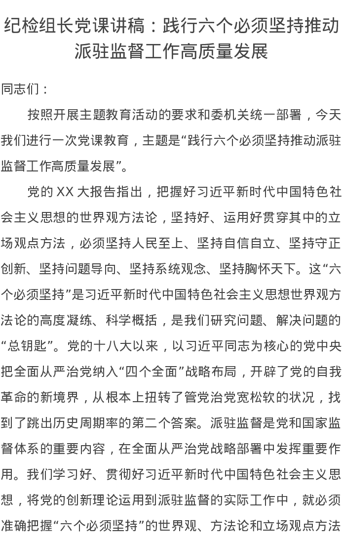 纪检组长党课讲稿:践行六个必须坚持推动派驻监督工作高质量发展