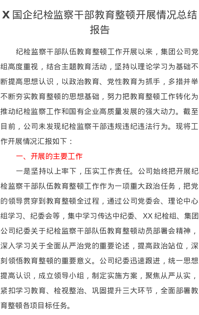 X国企纪检监察干部教育整顿开展情况总结报告