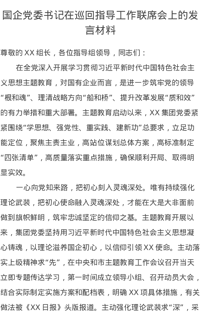 国企党委书记在巡回指导工作联席会上的发言材料