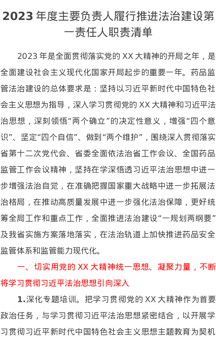 2023年度主要负责人履行推进法治建设第一责任人职责清单