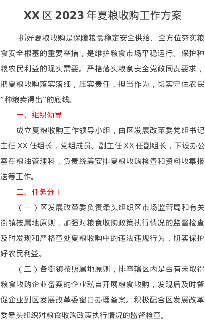 XX区2023年夏粮收购工作方案