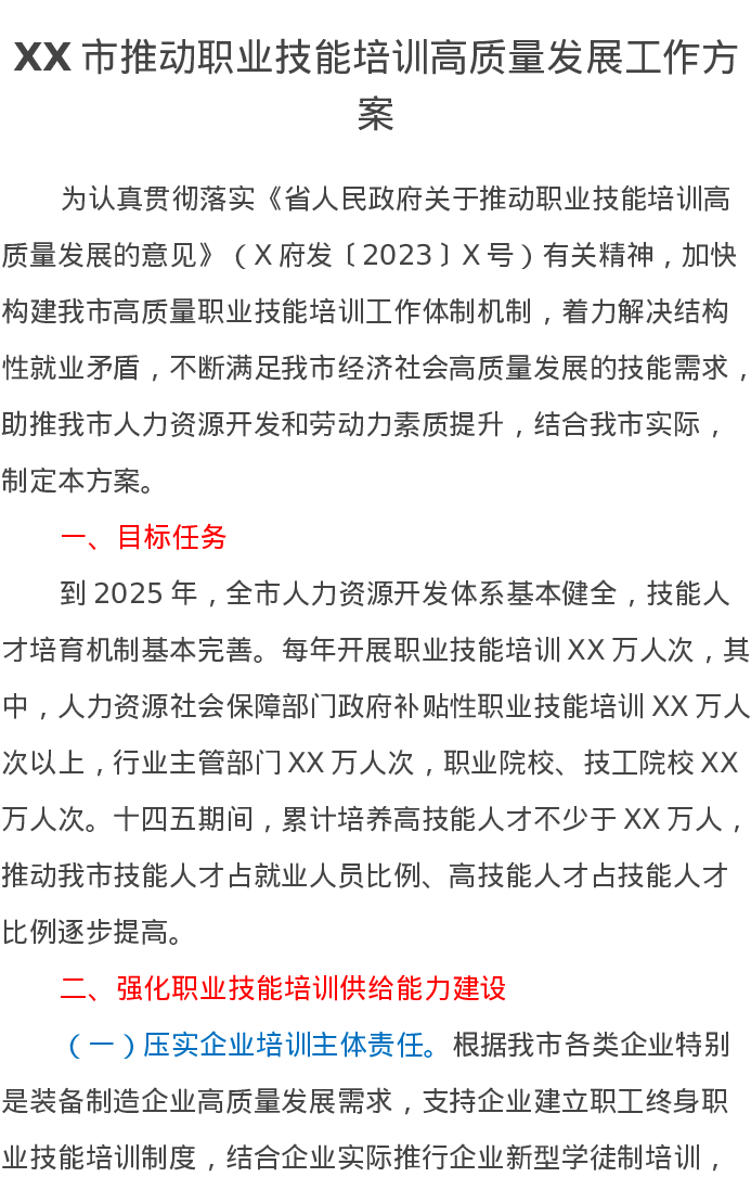 XX市推动职业技能培训高质量发展工作方案