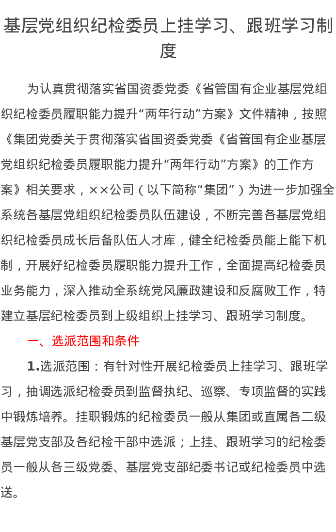 基层党组织纪检委员上挂学习、跟班学习制度