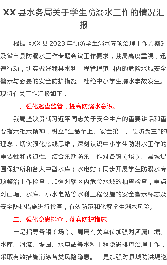XX县水务局关于学生防溺水工作的情况汇报