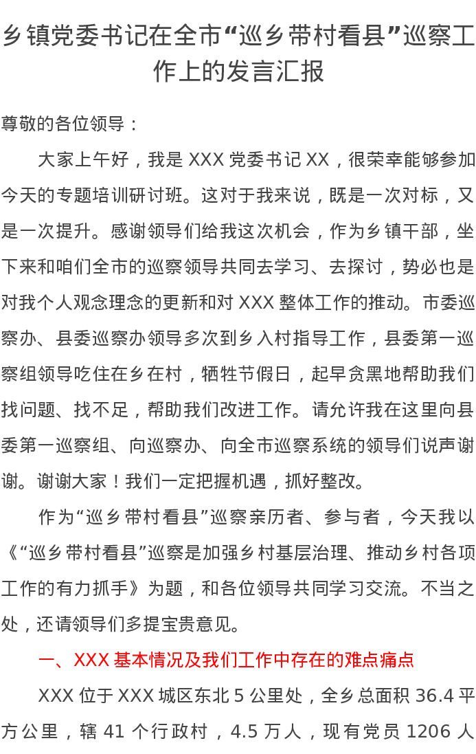乡镇党委书记在全市“巡乡带村看县”巡察工作上的发言汇报