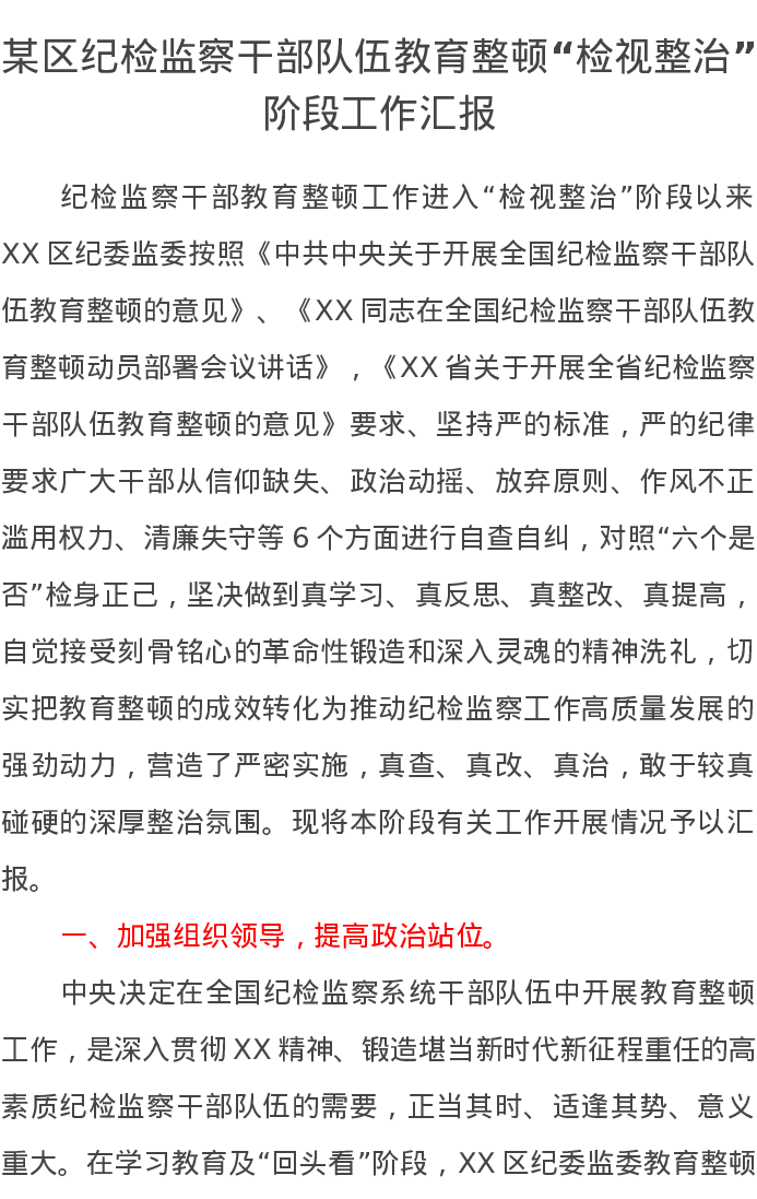 某区纪检监察干部队伍教育整顿“检视整治”阶段工作汇报