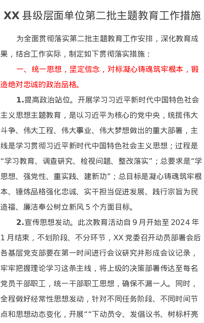 XX县级层面单位第二批主题教育工作措施(特色社会主义思想)
