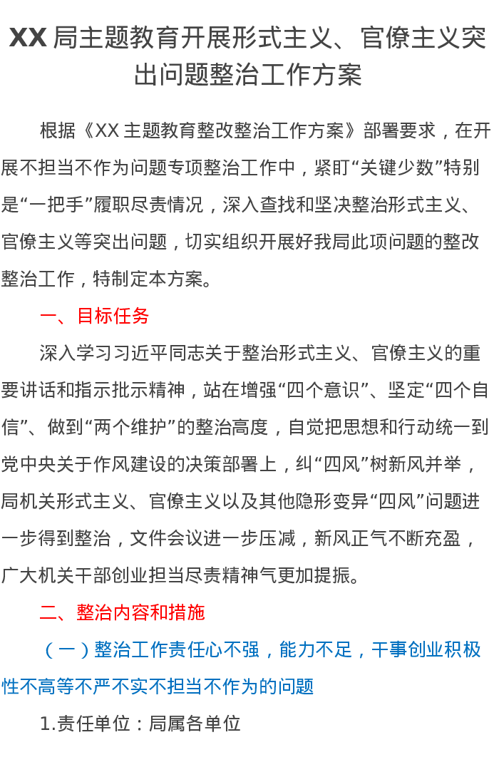 XX局主题教育开展形式主义、官僚主义突出问题整治工作方案(特色社会主义思想)