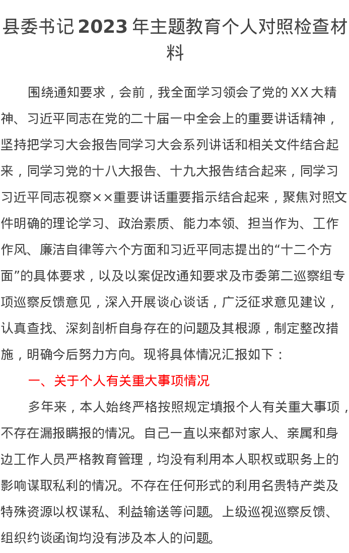 县委书记2023年主题教育个人对照检查材料(六个方面特色社会主义思想)