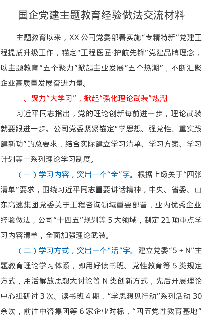 国企党建主题教育经验做法交流材料(特色社会主义思想)